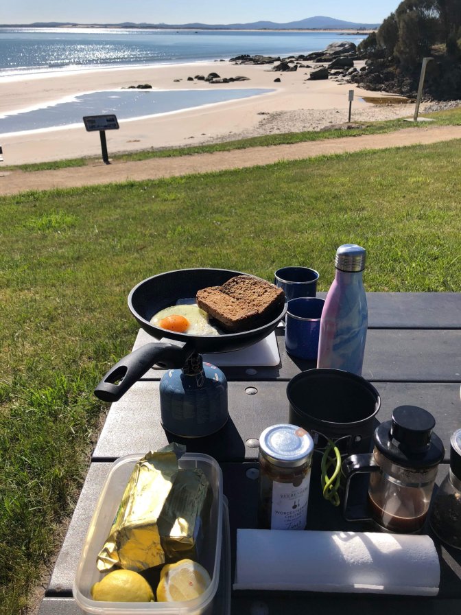 Bridport Caravan Park got rave reviews and did not disappoint. It’s a beautiful camping and caravan site stretched 4 kms along the beach with great facilities and beach access. Being off season we had a whole section to ourselves. Breakfast on the beach every morning was a treat.