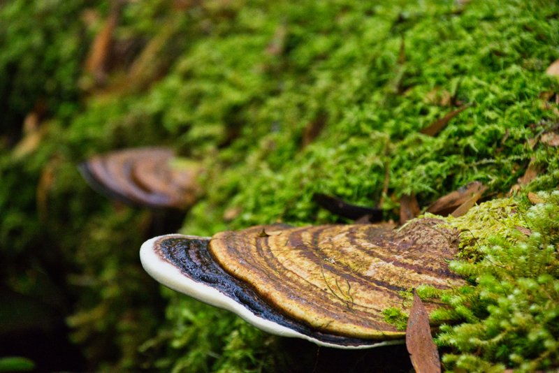 There was a lot of Forest Fungi. There was also evidence of path clearance. overhanging and dangerous trees were cut down and left to rot and compost and feed the next generation of growth, Mosses take hold quickly and turn the forest into a verdant paradise.