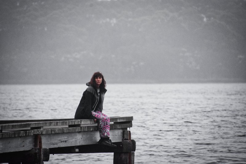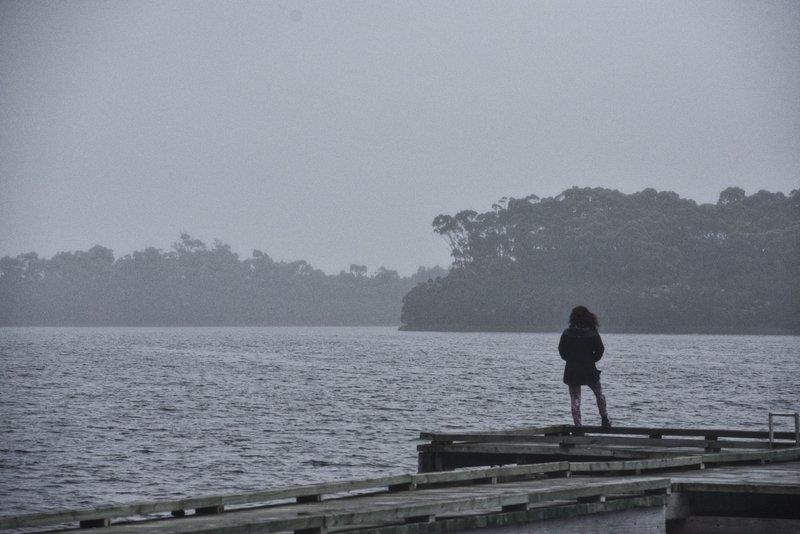 The weather turned as we left the People’s Park. In Ireland, where I come from and where it rains 300 days a year we have a lot of words to describe the various types of rain. I would have described this type of rain as Mizzle. Half way between mist and drizzle. On a walk the previous night we spotted a short jetty with a great outlook which was perfect for atmospheric pictures. It couldn’t have been more atmospheric than this. We stopped and jumped out into the mizzle. Jenni did her Tasmania’s top model best performance and this was the result. The world turned monochrome. I took these before I realised the lens was covered in mist, and I had the ISO setting all wrong but I think they came out ok.