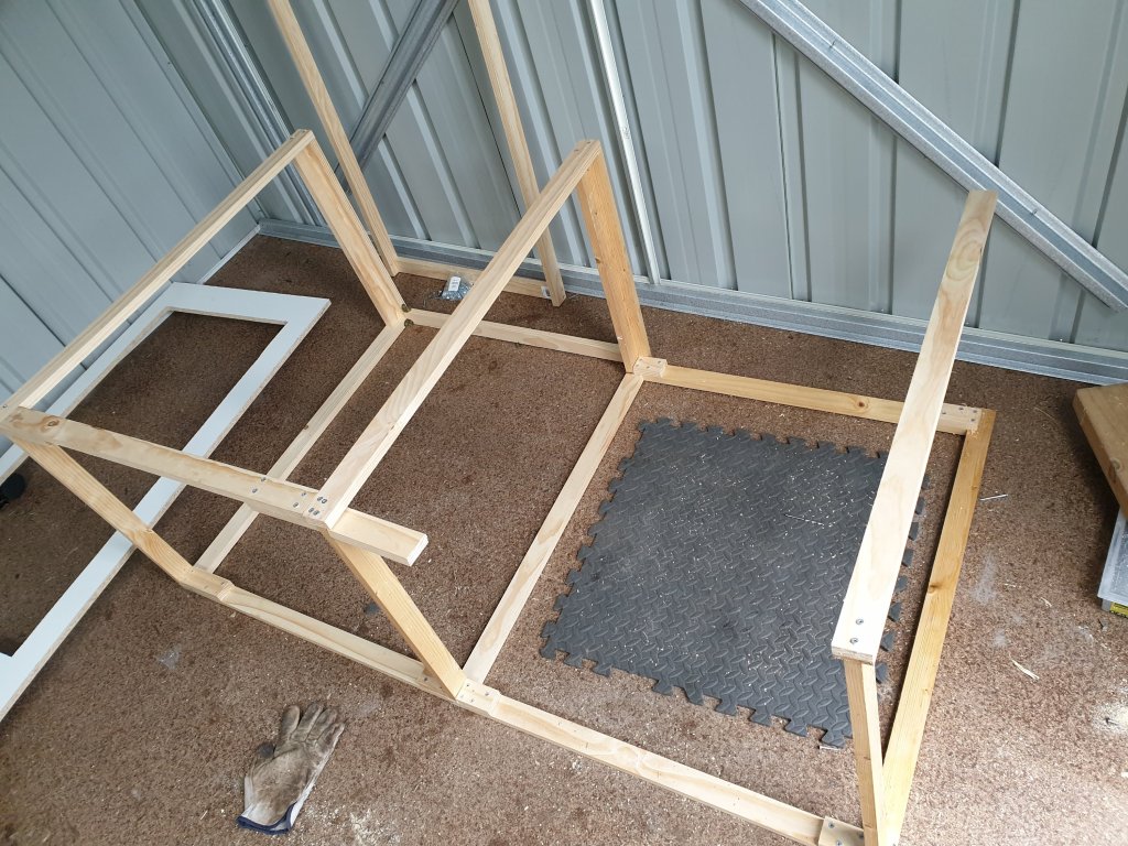 I designed a basic frame for the sink and kitchen unit. A trip to Bunnings later I had all the bits I needed. The frame was 4 rectangles joined at each corner to form a long box I could set a counter top on. I’d cut a sink sized hole in the counter top and fit the sink.