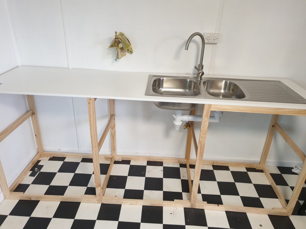 I plumbed it in, removed the old temporary tap and ran the waste water out to the grey water catchment tank. We still have to build the grey water filtering system so for now the water is used for the trees and the plants. I installed the shelves the cooker and the work bench. It all works a treat.