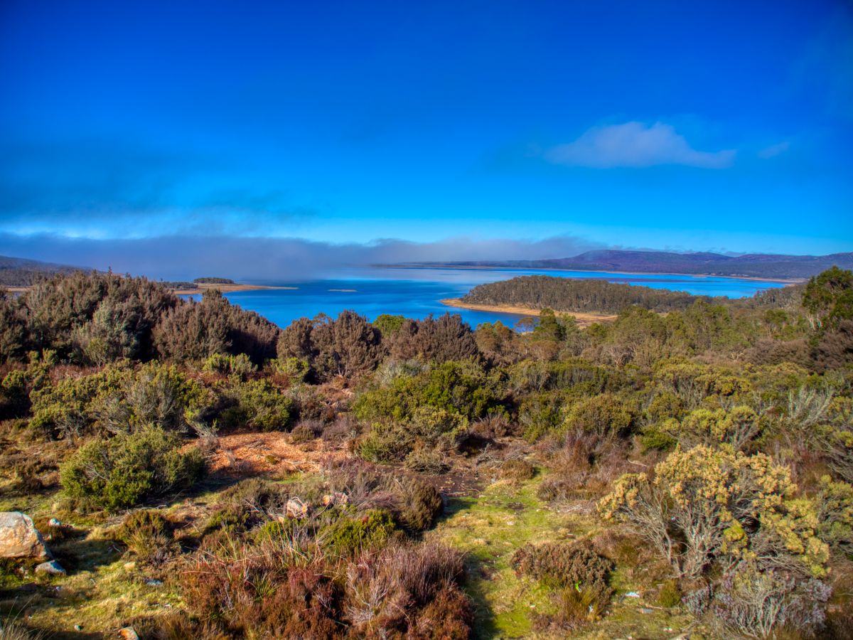 I suspect Little Pine Lagoon is where we have just come from. Might come back next July when Lake King William traditionally turns orange. Passing the Great Lake the mist sat patiently on the horizon like it wanted to have a picture taken, so I obliged.