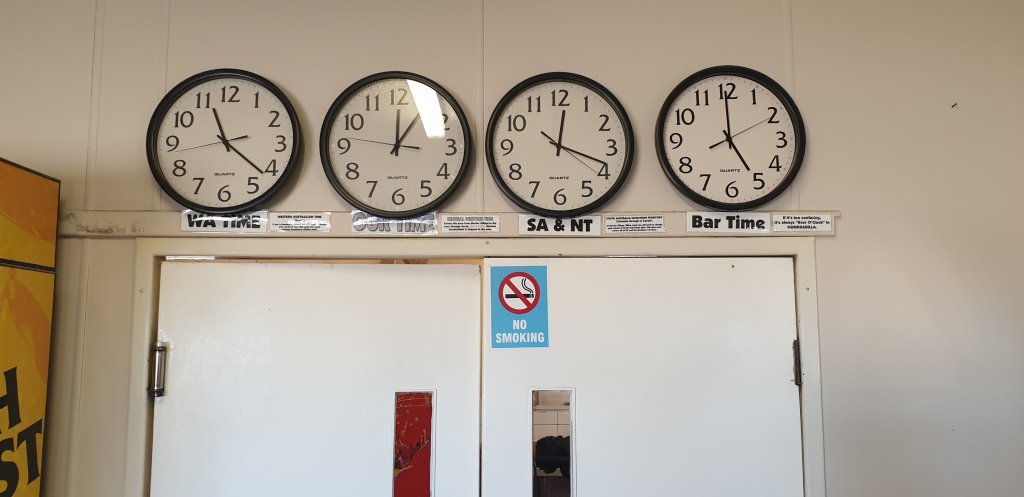 To try and answer the question, “What time does it get dark at our destination and what time will we arrive?” we need to factor in time zones. Australia has 3 official time zones, Australian Eastern Time, Australian Central Time and Australian Western Time. These, along with Daylight Savings Time, are to allow for dawn and sunset to be in roughly the same time in any part of the continent. However along the Nullarbor they’ve made up their own time zone. There’s 1.5 hours difference between time zones in South Australia and Western Australia, and some point in the Nullarbor this was considered ridiculous as dawn might be at 4am or sunset a 3 in the afternoon, so they created a new “unofficial” time zone called Australian Central Western Time that is 45 minutes ahead of Australian Western Time and 45 minutes behind Australian Central time. Satnavs, phones and Windows automatic time zone changer stuff has no clue about this magic time portal zone shift effect thing. Hotels and roadhouses, on the other hand, use this time exclusively. There were clock displays like these in every roadhouse.