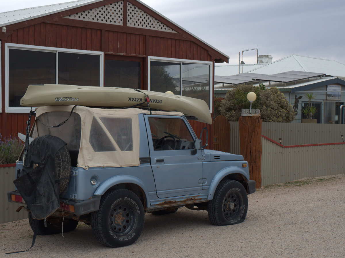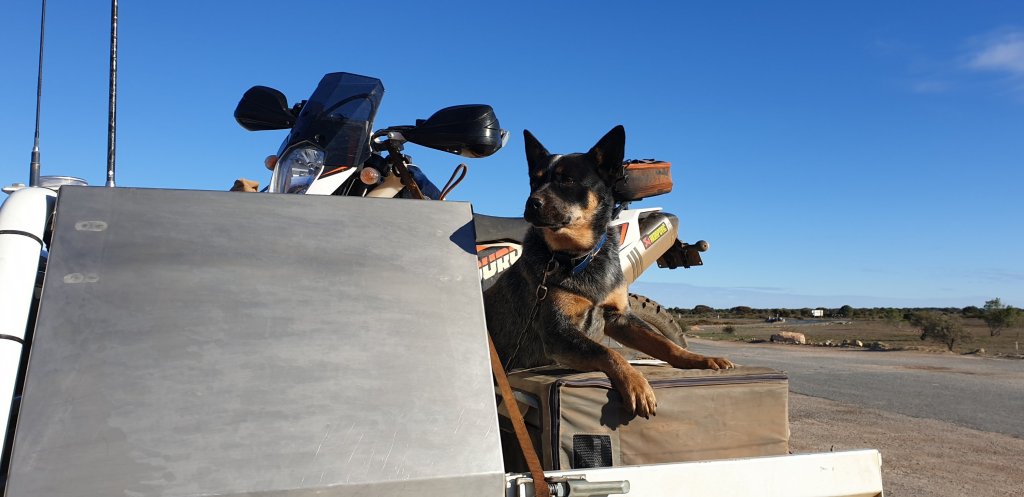 We had the biggest breakfast we’ve ever been served, everything cooked to perfection. It fed both Jenni and I and set us up for the drive to the Wedgetail Inn at Cocklebiddy. Parked beside us as we left was this lovely fella left guarding the ute. So cool he’s worthy of a space in this blog.