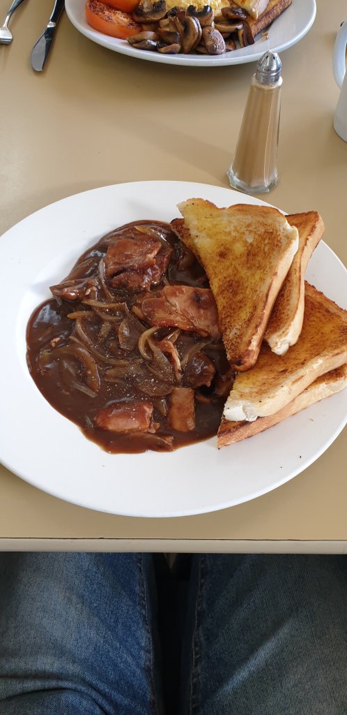 Not far into the longest straight stretch of road we pulled into Caiguna for breakfast. When I saw they had liver and bacon in thick onion gravy I was hooked. This was one of my favourite meals when growing up on the farm. It looks a mess but it was delicious and took me straight back there.