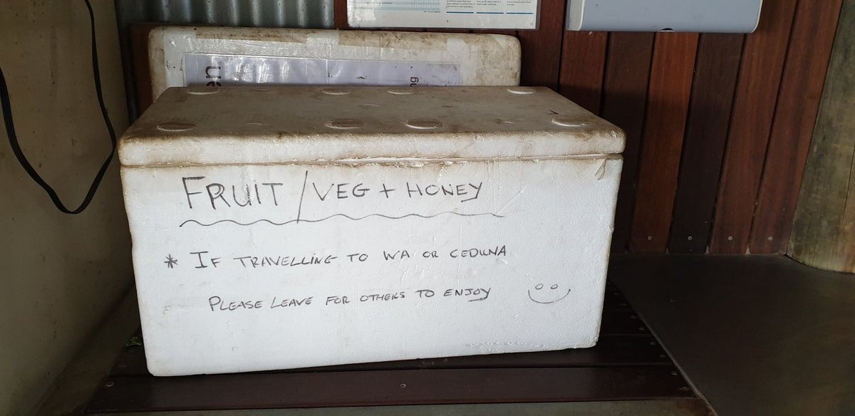 There’s a significant quarantine station at the border controlling what comes into South Australia or Western Australia. Honey, fresh fruit and vegetables are strictly controlled, as are logs with bark on them. The camp site has this box to leave any food in before you cross. It was usually full. Simon and Robyn, owners of the camp site, used the vegetables left for the camp cookup the next night.