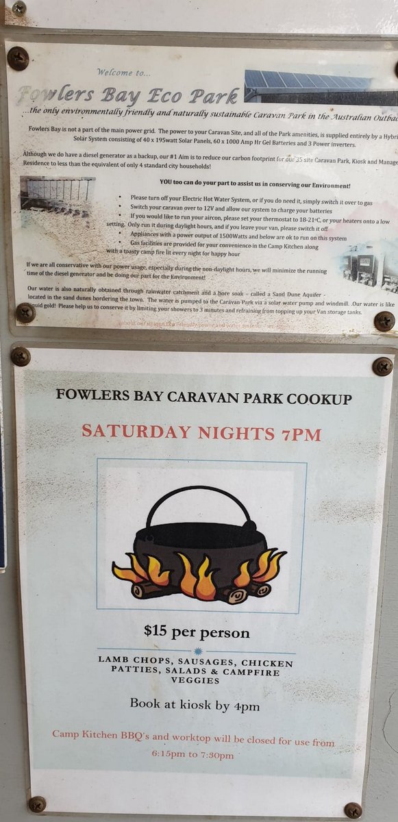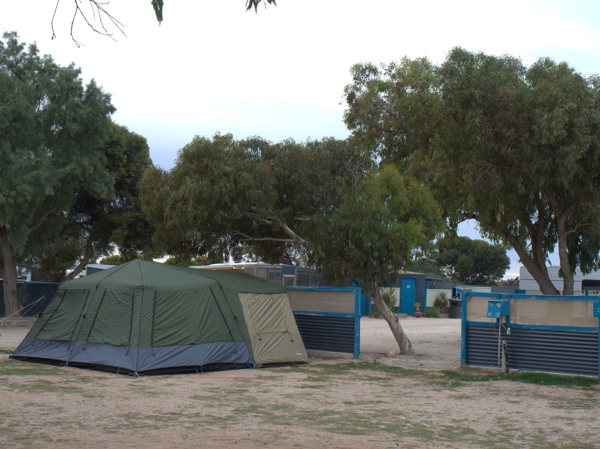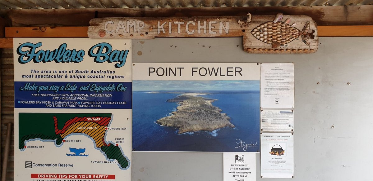 Fowler’s Bay camp site is small and has only 4 places specifically for tents. The ground is hard dirt but level and clean. Much better than some we have stayed at. The facilities were great for being off grid, hot water showers and a camp kitchen right next door. A gazzillion batteries and a few massive inverters driven by solar and topped up in emergency by diesel provide 1.5kw of power to each site. It’s very high tech.