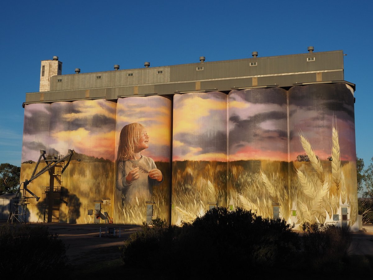 We arrived almost at sunset and the painted silos we’d read about were illuminated in the most glorious light. We’ve seen a few other painted silos and they are all wonderful but these are particularly beautiful. The scene is a sunset scene and as we arrived at sunset it was pretty spectacular.