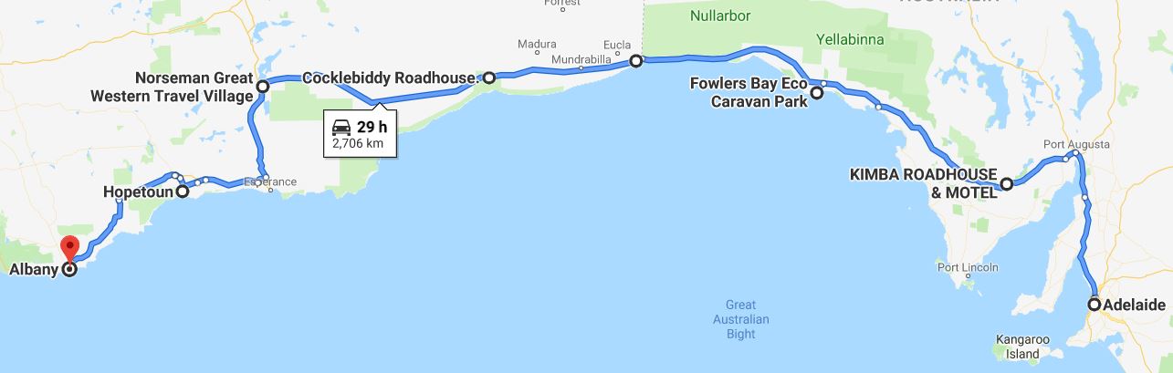 Adelaide to Albany, didn’t sound like much to me at first. But it’s longer than driving from New York to Las Vegas, more than the distance from Land’s End to John O’Groats and back again, farther than from Manchester to Malaga. Almost as long as this blog, but not quite. So before you read on, go get a drink. You may be some time.