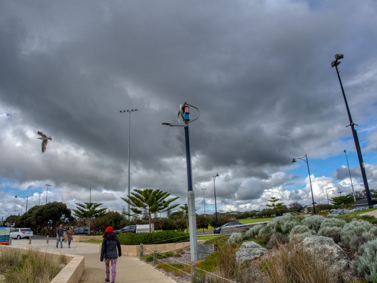 One of the things most interesting about Busselton Esplanade, not found in any guide books, is the environmentally friendly street lamps. They have strips of solar panels and a wind turbine on top of each one.