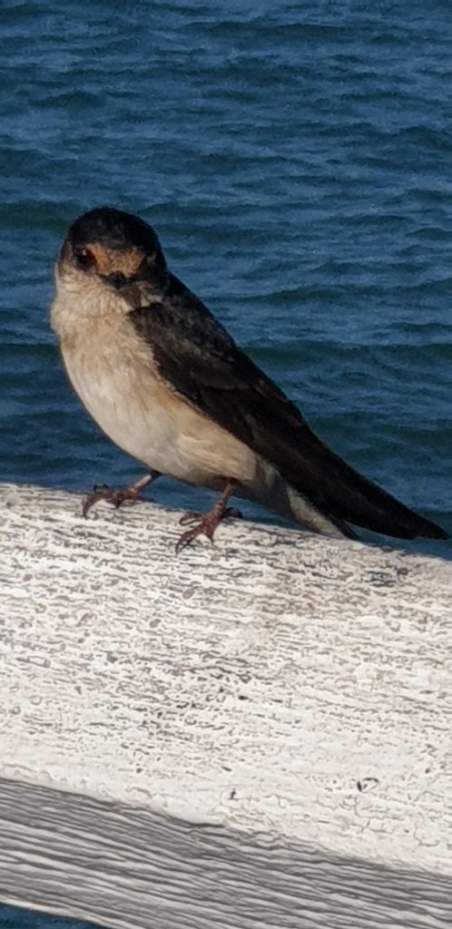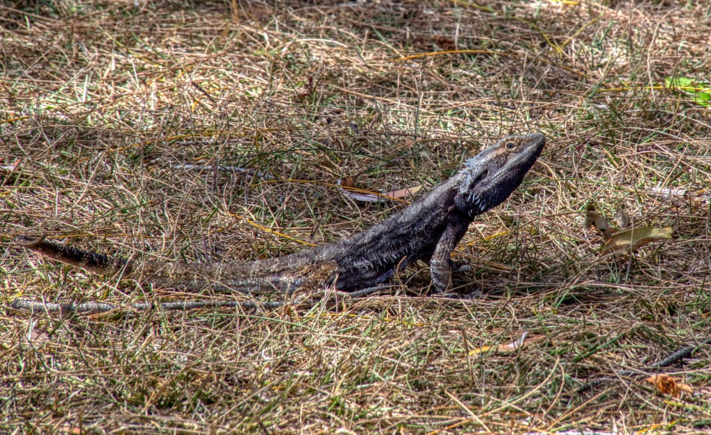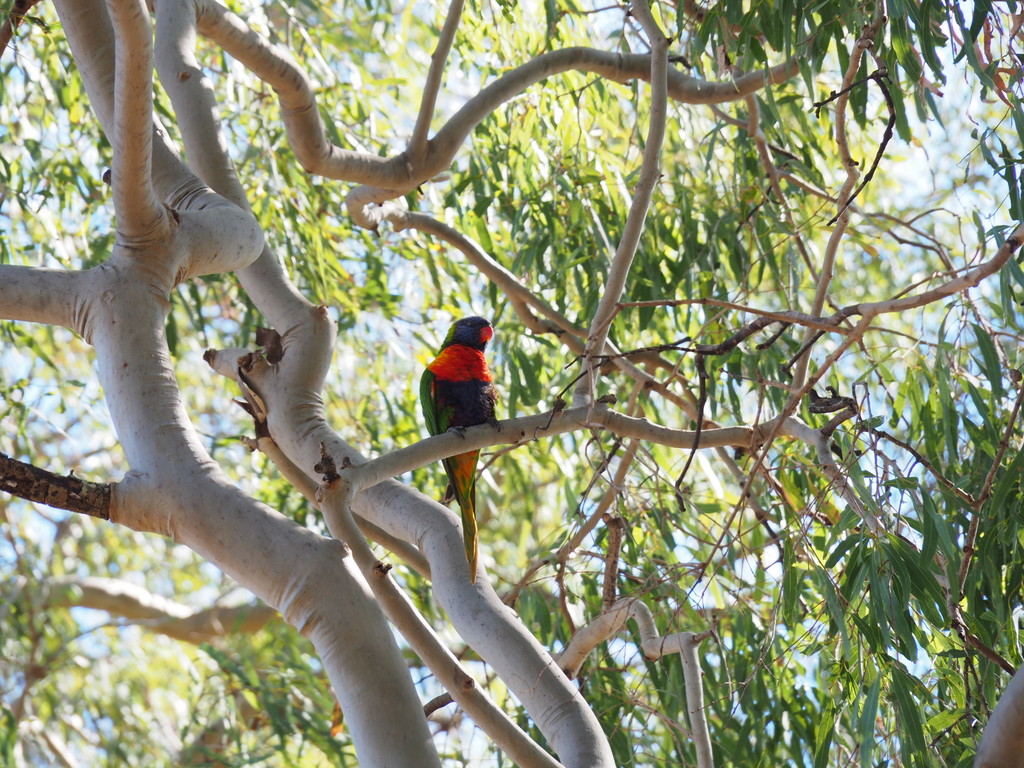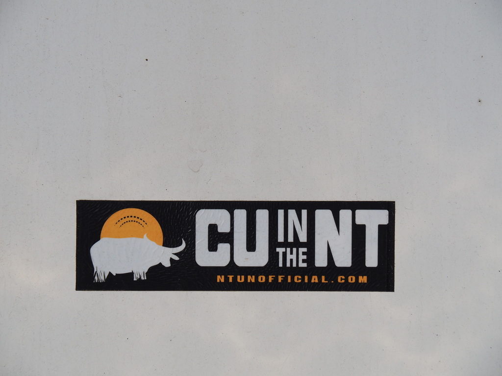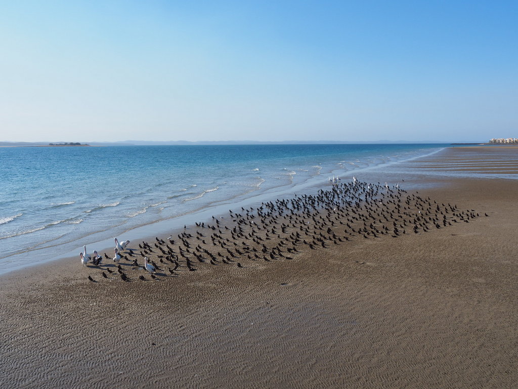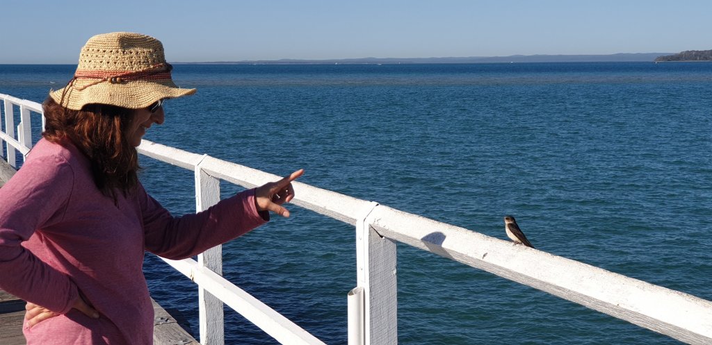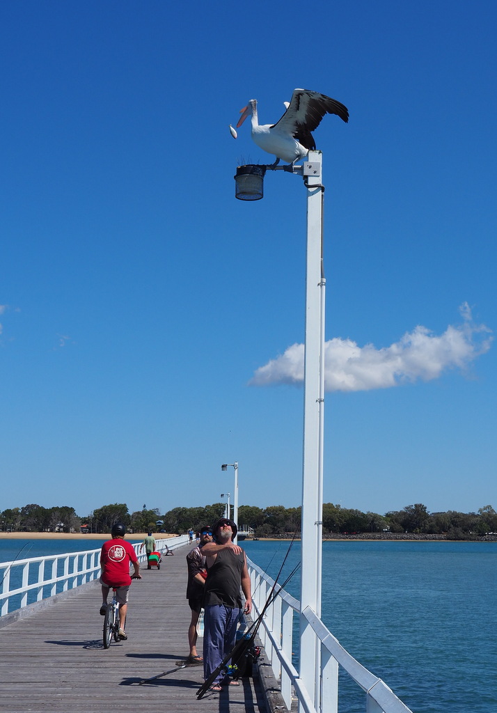 There was plenty of wildlife around. This little guy and lots of his friends chirped and chattered at us all along the routeThis fella didn’t talk much at all. He was just sitting sunning himself but ran away when I got too close.This one didn’t speak or move at all.The statue of the fish and the boy at Urangan Pier. The Urangan Pier Entrance statue is made of Cast Bronze and was created from an original cardboard pattern. Commissioned by Hervey Bay City Council as part of Councils Public Art allocation. Pelicans sit on the top of almost every light along the pier. This lucky one was being thrown small fish by the fisherman. There were always plenty of fishermen and women at the end of the pier. Some of them rode specially modified bicycles.Pelicans and cormorants hanging out together at the end of the pier when the tide goes out. Not sure why they sit at this spot in this configuration.Our Facebook friends will have seen this one already. Seagull catching a fish.Saw this sticker on a large motorhome. Unofficial tourism advert for the Northern Territory. Quite memorable. The joke was the subject of a news article where the Northern Territory tourism board had to deny, on prime time TV news, that they had nothing to do with it. Secretly I bet they were very pleased, it obviously gave them more publicity than they could have paid for themselves.Jenni having a conversation with one of the many little birds that flew all around us as we walked along the pier