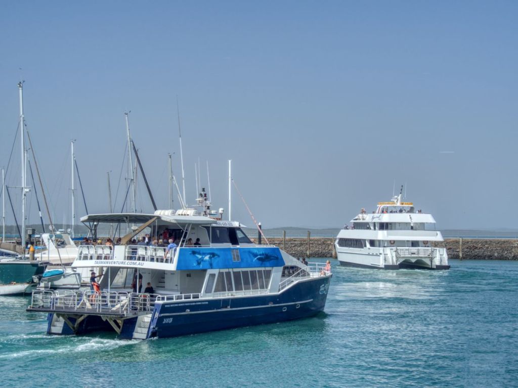 Two of the many whale watching tours heading out to seaAnother tour boat returning