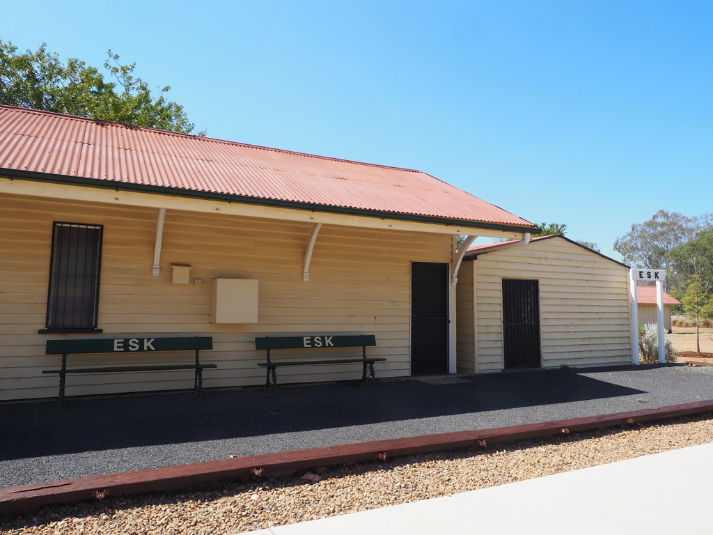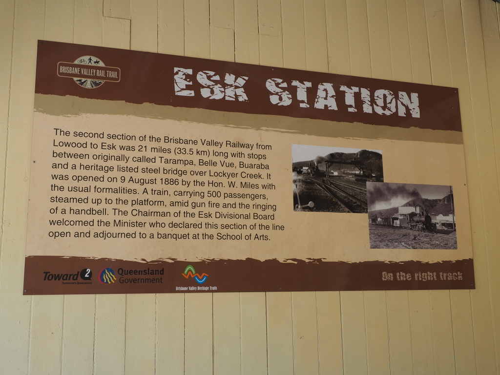 The railway line reached Esk in 1886 when the line was extended from Ipswich. This railway line has been unused for many years and has been turned into the Brisbane Valley Rail Trail. This is a walking / riding track now extending over 160 kms, the longest rail trail in Australia, that is very popular with bike riders and horse riders.