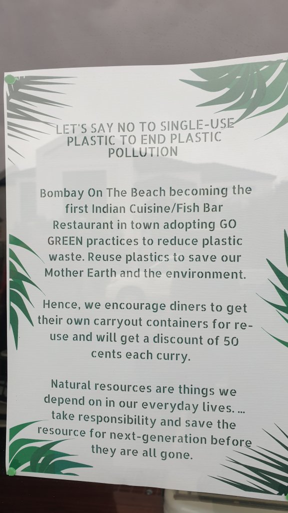 The food was ok, a bit bland. It was also apparent they were not really taking the Go Green very seriously as there were dozens of people collecting their take away meals in plastic boxes in plastic bags. The bags did have “Please recycle or reuse me” in large green friendly letters though so thats ok. Did not see one take away meal in anything other than plastic boxes. Plus they had straws in drinks. It was very disappointing.