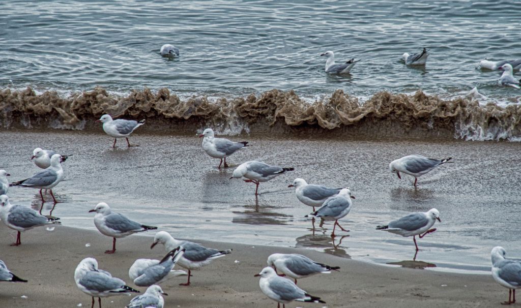 The 10:15am group arrivingThey’d swoop in and head straight for this pool of ‘freshwater’ and drink heartily. As each wave of seagulls came in some left to make room for them.Then they’d go hang out in the shallow, calm waters by the shore and wash themselves for a while, dipping their heads and bodies under the waters a few times. It reminded me of a day spa for seagulls.