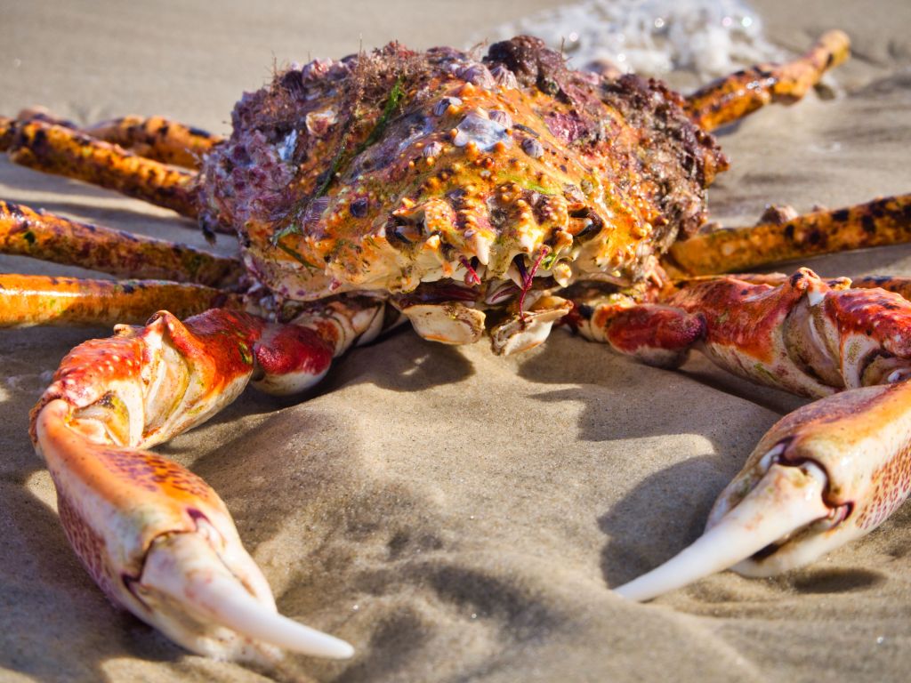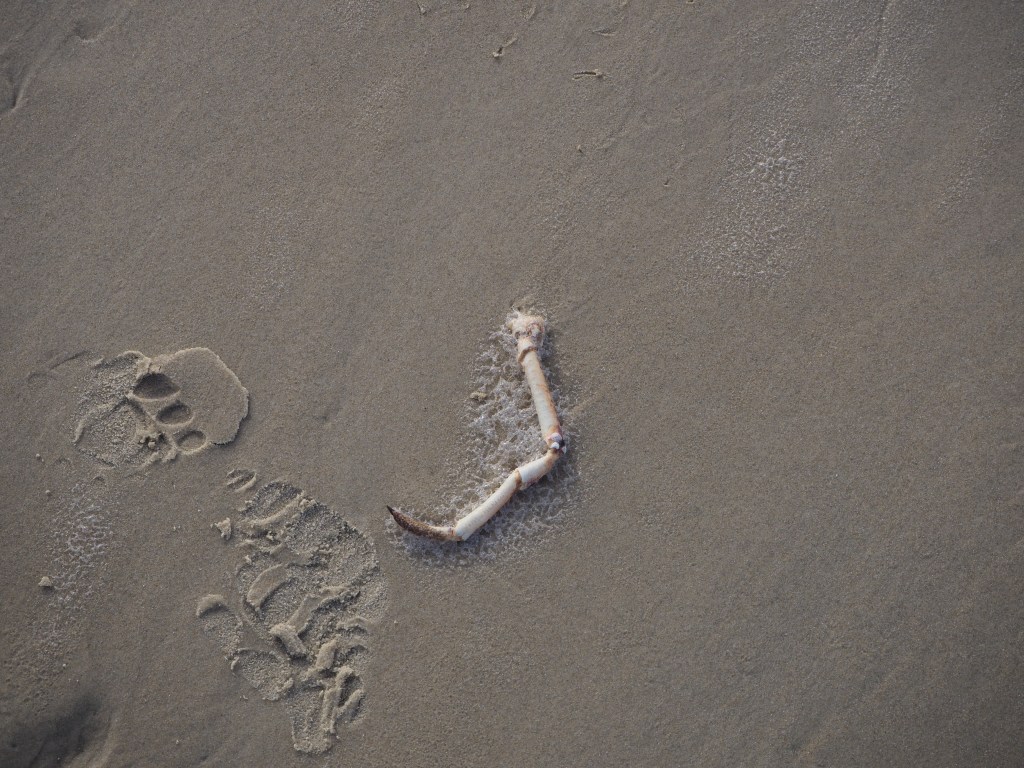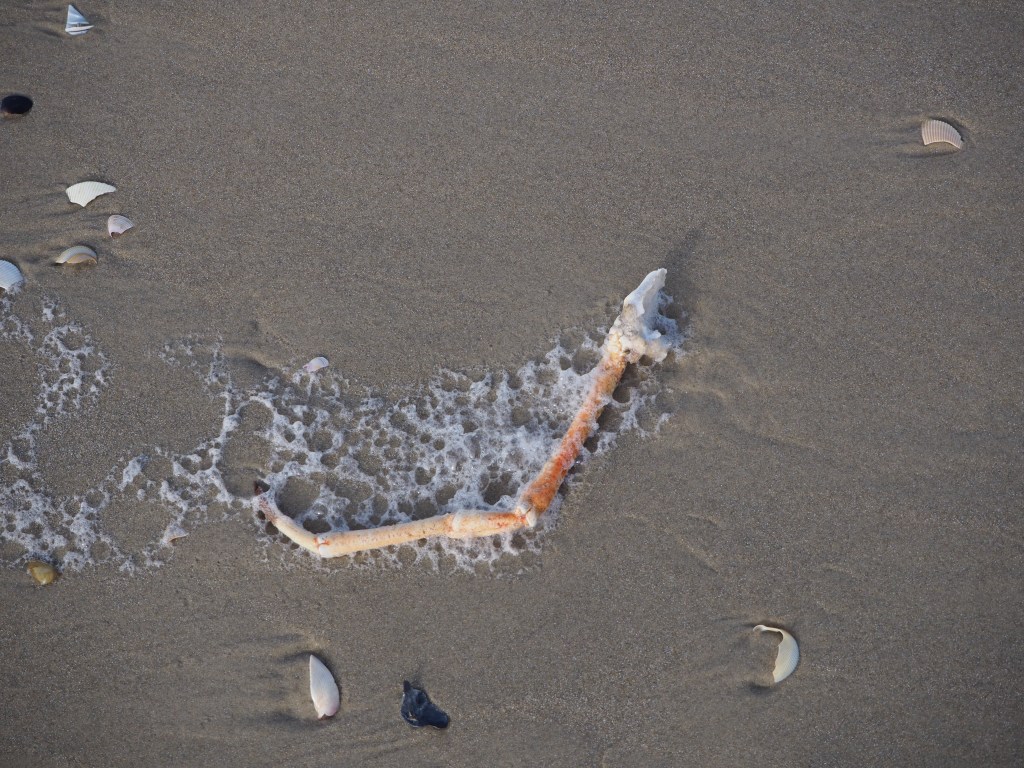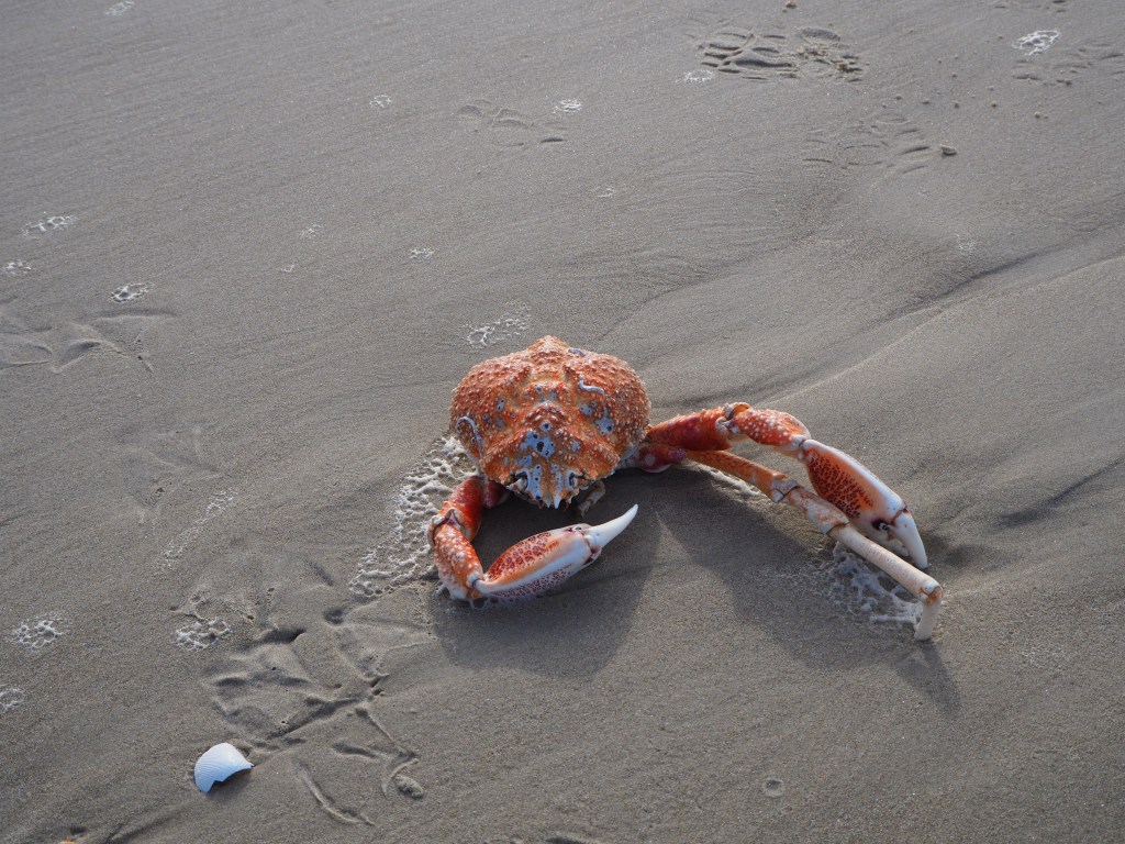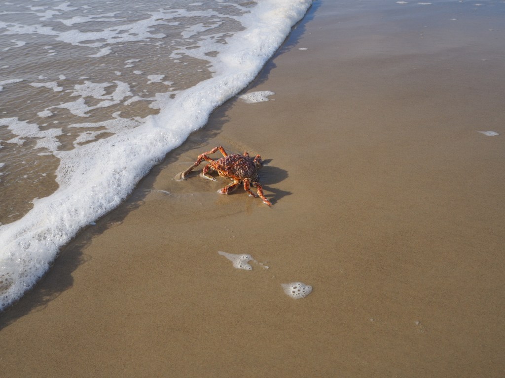 After crossing a narrow bridge across some eye wateringly beautiful salt marsh wetlands we drove through a small collection of beach shacks which makes up the Marion Bay enclave and parked in the car park next to the lookout platform.From the lookout we could see the beach stretch North-South. To the north Bream Creek cut across the beach blocking us walking that direction, it was also quite early so this is taken almost directly into the morning sunrise.Therefore we set off in a southerly direction towards the end of the spit.The first thing we noticed was the sand was pristine and white, bad picture I know. The second thing we noticed was a giant crab leg.Then another…… and another.Then farther along the beach we spotted a Pacific Gull eating something. When we got up to it we discovered it was eating the guts out of a whole crab. You can see the birds foot marks in the sand behind the crab. We were pretty amazed at the size of this thing.As it turned out gulls eating dead crabs was a common part of Marion Bay’s circle of life. As we walked along we’d often see a gull pecking at a crab carcass then as we got near the gull would fly off and after we went past it circled back and resumed its breakfast.This one though, we could clearly see from the distance, was still moving. The gull would peck it a bit and the crab would try and crawl away. The gull would then peck it a bit more. It clearly liked its crab extra fresh.Jenni was in full crab preservation mode at this point having a stare off with the gull. But as you could clearly see the prognosis for the crab was not good.As soon as we got past he was back at it again.After some research we discovered they are Tasmanian Giant Crabs. This is what they look like close up. As our friend Sherrill said, a face only a mother could love.Enough about crabs. To the north (and slightly east) the rising sun made the beach glow with the most wonderful light.To the south the pristine white sand stretched into the distance.Along the edge of the beach was a mixture of sheer sand cliffs and small sloping grass covered sand dunes. This is Jumping Jenni on her way down one of them.At the end of the spit we saw lots of birds resting in the dunes and on the sand. As this was a bird sanctuary and there were signs everywhere reminding you to leave the birds alone we turned back so we wouldn’t disturb them. We did however spot these beach shacks hidden under the forest canopy across the bay. A pretty neat place to have a home I’d say. The sun had risen a bit higher int he sky by this point leaving a muted orange colour in the higher whispy clouds. The island across the gap is the southern tip of Maria Island which we hope to visit very soon.As the sun rose higher the sand cliffs caught the light. The green rolling hills behind made a very nice scene. Jenni spotted this scene for me. I’m glad she did.