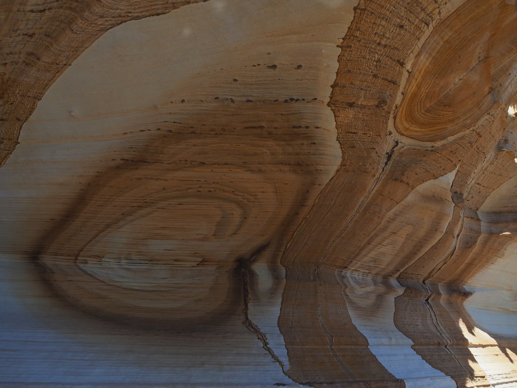 From the Maria Island web site; “The Painted Cliffs are made up of Triassic sandstone, when large rivers deposited deep layers of sand across broad flood plains some 200-250 million years ago. This sand was then compressed over time to form the soft rock we see today. The iron oxide patterning was deposited much more recently, within the last 10 million years, when Tasmania was experiencing a monsoonal climate. Extreme rainfall events leached out iron from the dolerite rocks above the sandstone, seeping into the softer rock through natural weaknesses in its layering. This very wet time was then followed by periods of extreme dryness, which drew the water back to the surface, leaving the iron oxide behind to be eroded and exposed by rising sea levels to reveal the patterns we see today.”