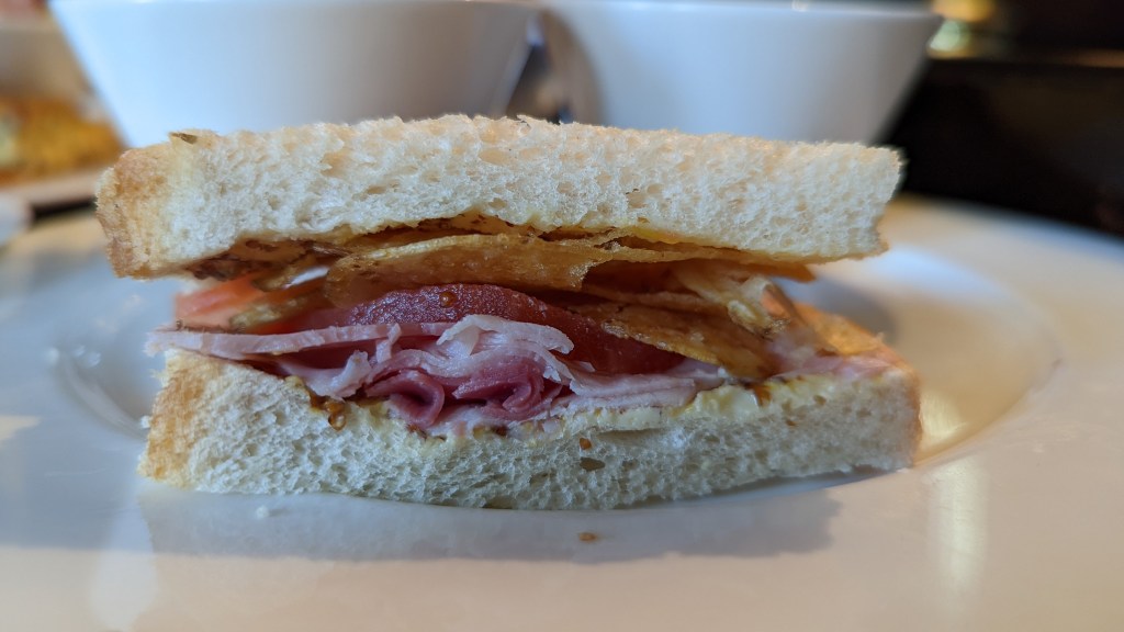 The restaurant, originally opened and run by culinary royalty Albert Roux is now run by his son Michelle Roux Jr. We booked a table for dinner on the way there and shortly fater arriving we got dressed up and headed down to the restaurant. It turned out to be a set menu of about 8 courses each. Now, if we go out we usually share a chicken parmy between us. It was going to be too much food so we cancelled our booking and had a bar snack each. I got a soup and a ham sandwich. The sandwich came with crisps so of course I put them in the sandwich too. You can take the lad away from the farm….
