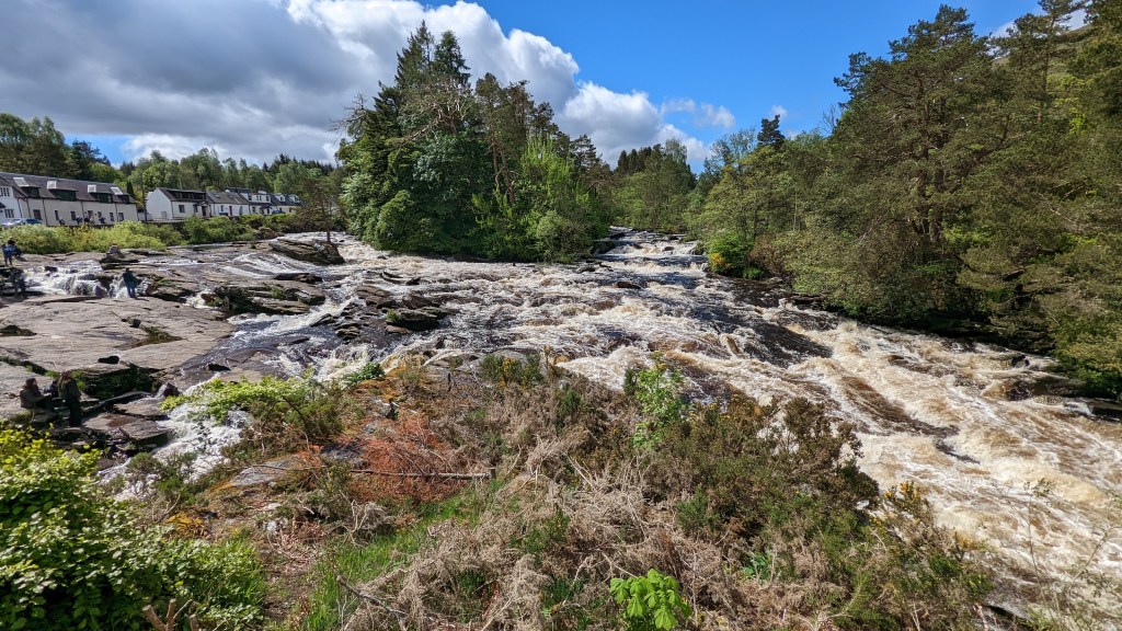 The drive from Oban to Mallaig was spectacular. Vast rolling green glens, magestic granite mountains, tall raging waterfalls and picture perfect postcard villages and stuff like that. Basically just Scotland. On the way we saw a sign for the Falls of Dochart only a short detour away. We turned off. We were not dissappointed.