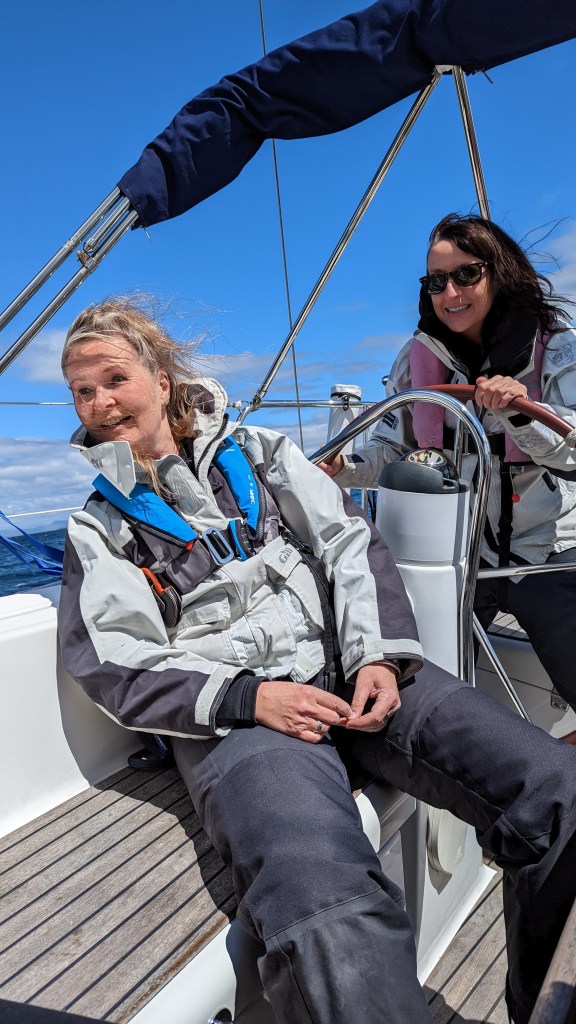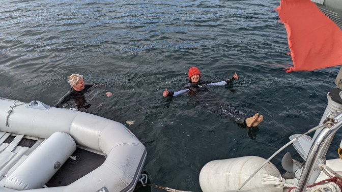 It was cold, oh so cold, and the girls did a lap of the boat. Jenni kept her hat on and feet out of the water when possible it was so cold. Kudos to both of you.